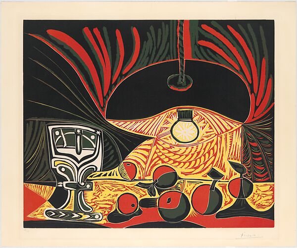 To create still life under a lamp, he first printed the uncut block in white on 80 sheets of paper (the edition was 50 but some sheets would be ruined in the printing process) because the other colors print picasso artwork. 'still life with lamp' was created in 1944 by pablo picasso in surrealism style.